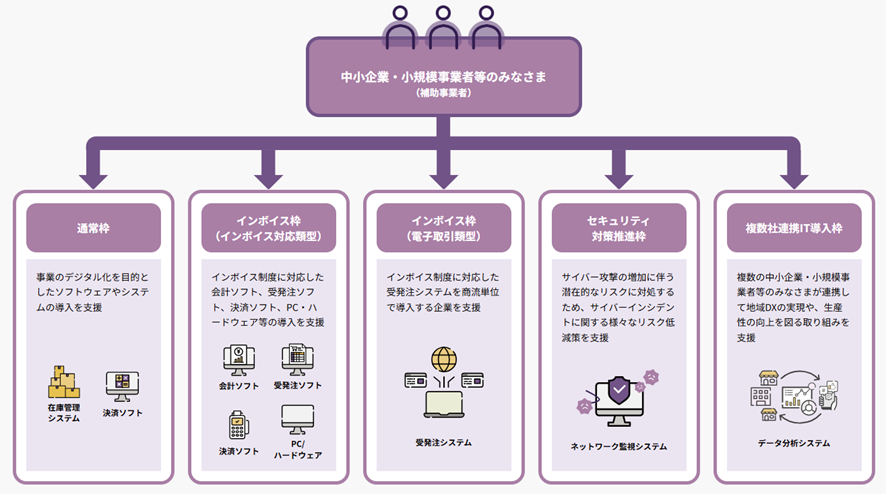 「IT導入補助金」は、経済産業省によって実施されている中⼩企業・⼩規模事業者等の労働⽣産性の向上を⽬的として、デジタル化やDX等に向けたITツール(ソフトウェア、サービス等)の導⼊を⽀援する補助⾦です。