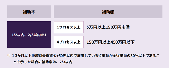 - ITツールの業務プロセスが1~3つまで:補助額5万円~150万円未満(補助率1/2以内)