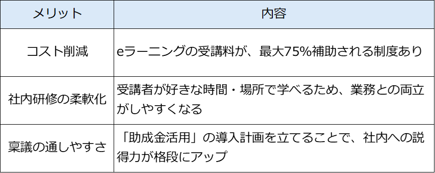 こうした課題を解決する切り札となるのが、「eラーニング × 助成金活用」です。主に以下のような具体的メリットがあります。