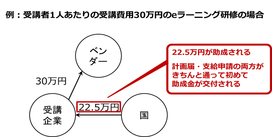 たとえば、30万円のeラーニング研修を10名で受講する場合、通常なら合計300万円の費用がかかりますが、225万円の助成を受けられると、実質負担は75万円(1人あたり7.5万円)に抑えられます。