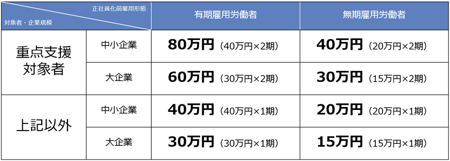今回の見直しでは、通常の正社員化では受給額が40万円に減額される一方で、「重点支援対象者」に該当すれば、昨年までと同様に80万円を受給することが可能となりました。