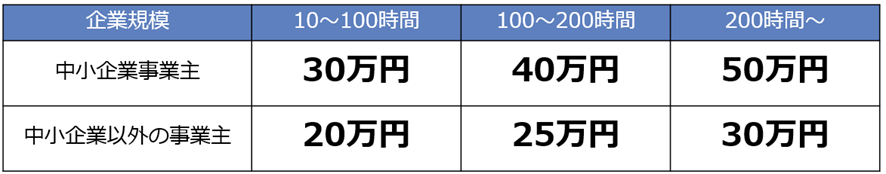 支給の限度額は研修時間数に応じて以下の表のように決められており、10時間の研修を受講した場合は、1回あたり30万円(中小企業の場合)まで支給されます。
