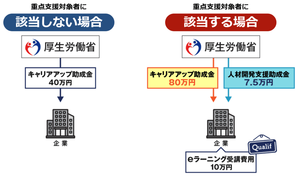 しかし、ここで人材開発支援助成金に対応したQualifのeラーニング研修『生成AI時代のDX』の受講をしていただくと、重点支援対象者に該当することとなり、キャリアアップ助成金80万円と人材開発支援助成金7.5万円を受給できます。