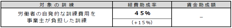 注2:訓練終了後に行う訓練実施者による評価で訓練前の賃金の支払い額を比較して5%以上上昇している場合、または、資格等手当の支払を就業規則等に規定した上で、訓練終了後に訓練受講者に対して、当該手当を支払い、かつ、当該手当の前後の賃金を比較して、3%以上上昇している場合に、助成率などが加算されます。