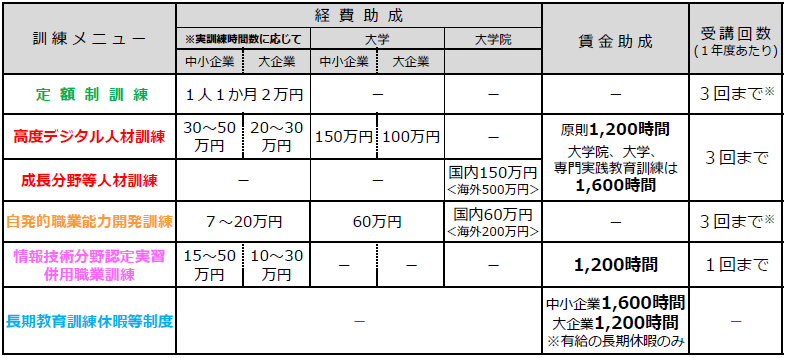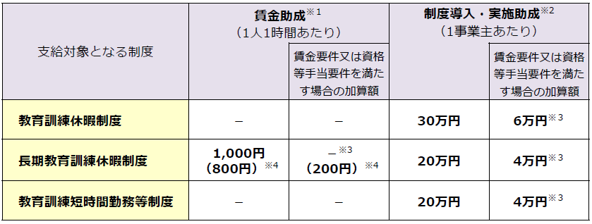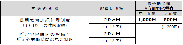※「長期教育訓練休暇等制度」は、経費助成を1事業主1回まで(定額)。賃金助成の人数は制限なし。
