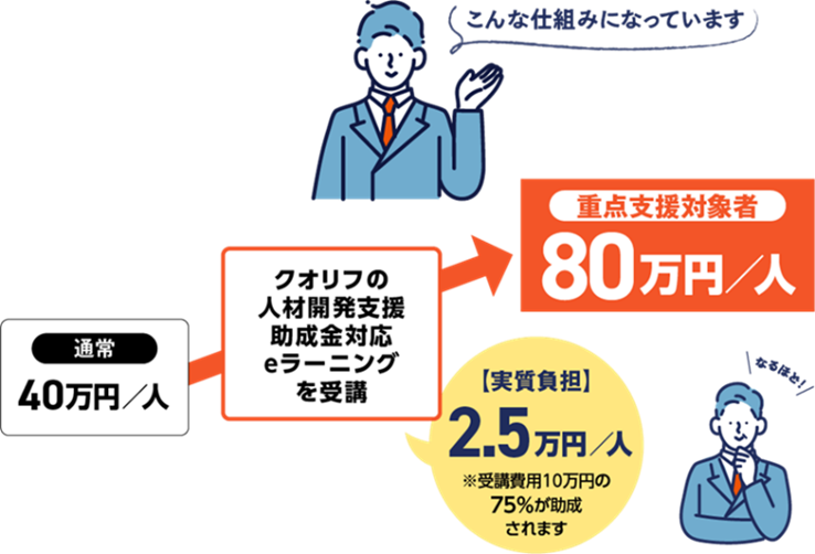 - 受講費用は1人あたり税込10万円で、75%が助成されると、実質負担は1人あたりわずか2.5万円です。
