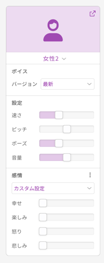 「幸せ」「楽しみ」「怒り」「悲しみ」などの感情のスライダーを調整することで、単なる棒読みではない、文脈に合った抑揚やトーンを作り出すことが可能です。