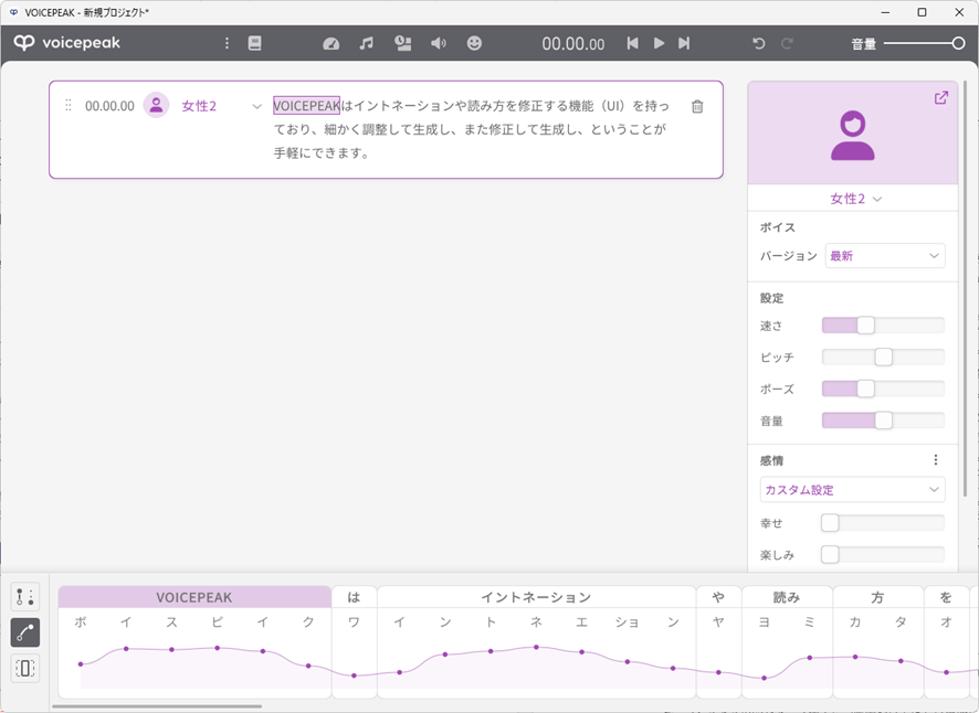 VOICEPEAKはイントネーションや読み方を修正する機能(UI)を持っており、細かく調整して生成し、また修正して生成し、ということが手軽にできます。