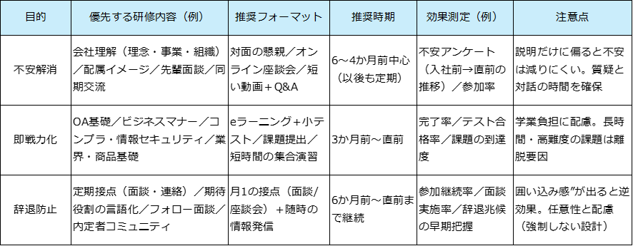 • 内定者研修の目的(不安解消/即戦力化/辞退防止)と、設計時に押さえるべき観点