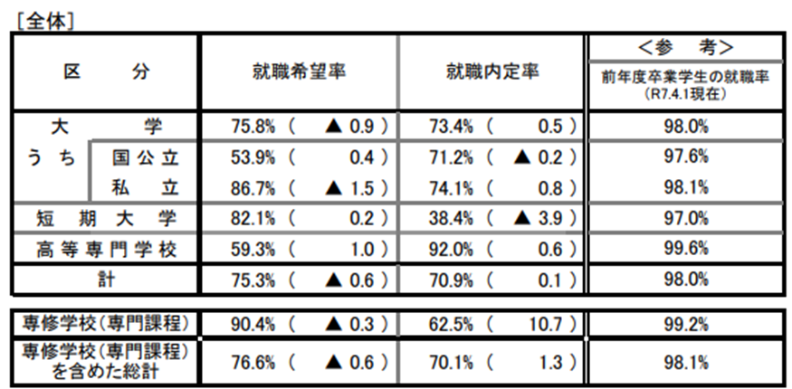 厚生労働省が発表している、大学等卒業予定者の就職内定状況調査によれば、令和7年10月1日現在の就職内定率は、大学等(大学、短期大学、高等専門学校)全体では70.9%、大学等に専修学校(専門課程)を含めると70.1%となっています。