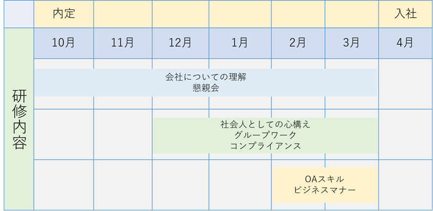 日本では4月1日の入社式が一般的であるため、入社6カ月前にはおよそ7割の就職希望者に内定が出ていることになります。そのため一般的に内定者研修は、入社前年の10月から翌年4月までの6カ月間で実施されることが多いです。そこで、ここでは入社6か月前からの内定者研修の一例をご紹介します。