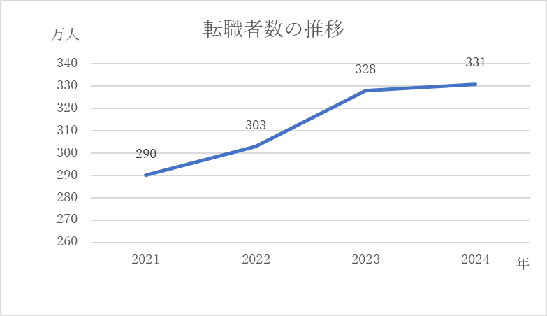 転職者の数も増加傾向にあり、総務省が2025年2月14日に発表した2024年労働力調査の詳細集計平均結果によると、年間の転職者数は約331万人(前年比0.9%増)と3年連続で増加しています。